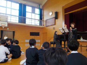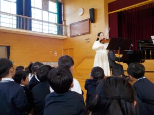 たつの市音楽協会による出前講座 11月11日(火)に、たつの市音楽協会の3人の音楽家(声楽・ピアノ・バイオリン)の方に来ていただき、教科書で学ぶ音楽の演奏を聞かせていただきました。生演奏を間近で聴けて、本当に贅沢な時間となりました。